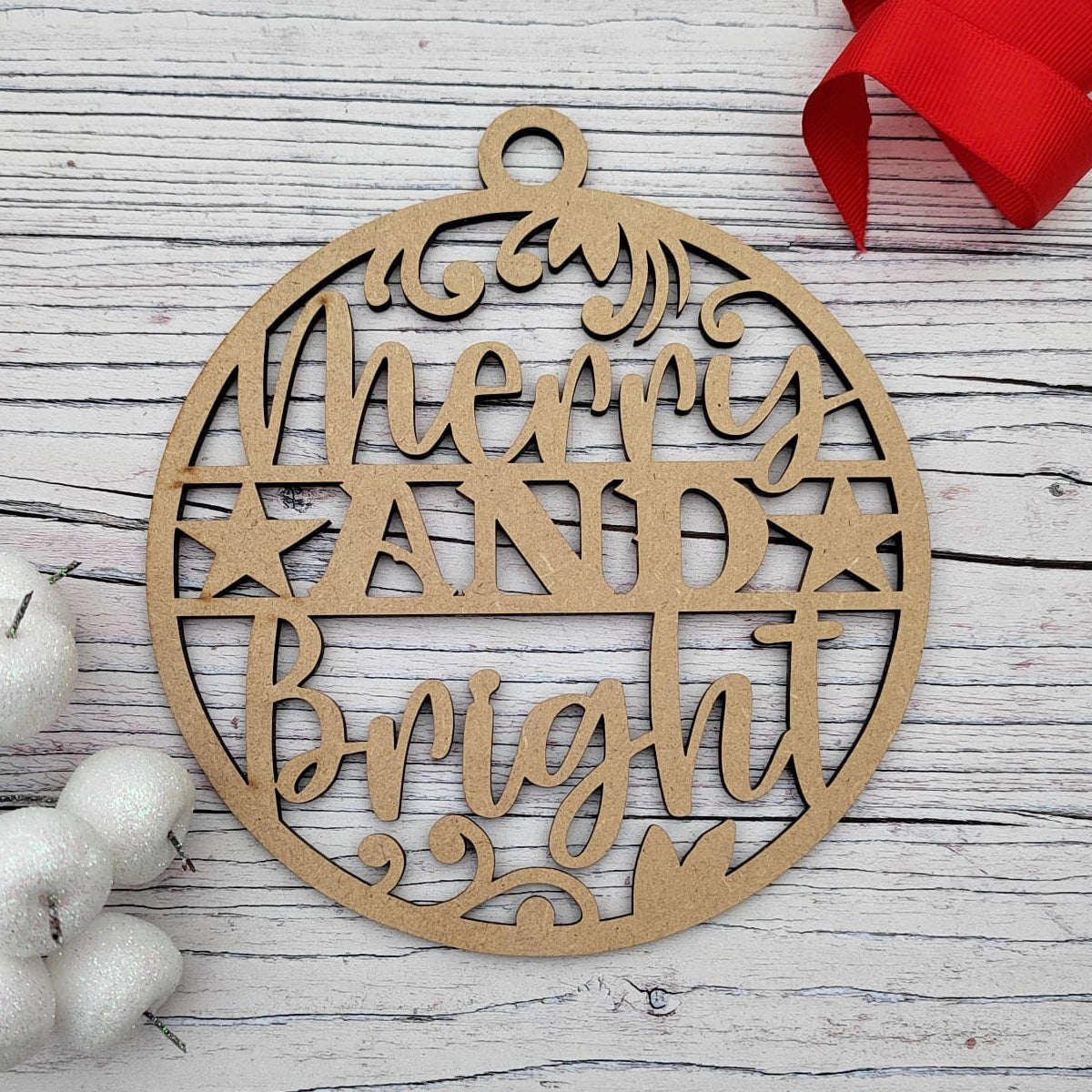 A large Christmas bauble plaque, with a circular frame, and cut out Merry and Bright design.