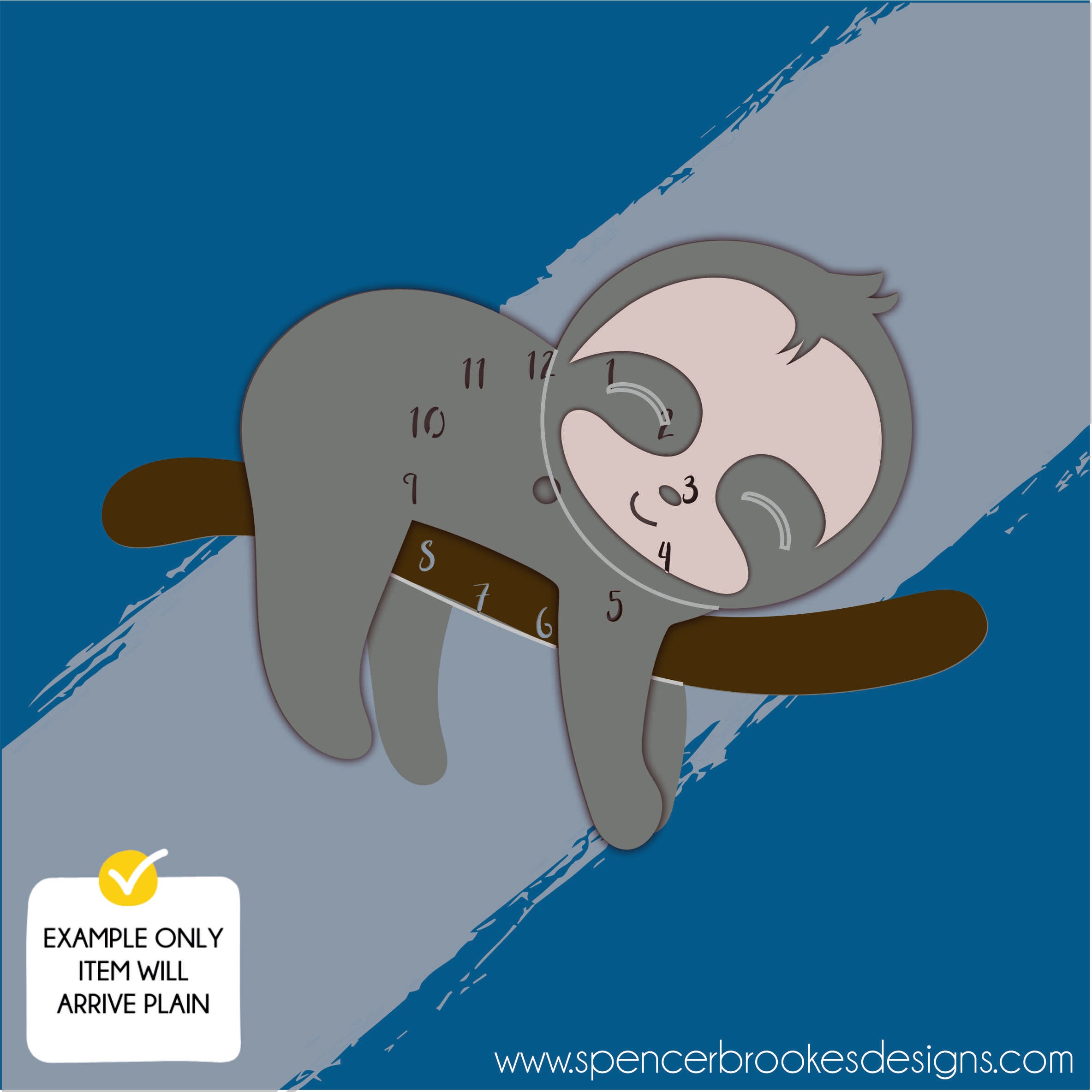 Layered sloth shaped clock with 3D details, and cut through numbers. Comes in multiple parts, and includes black mechanism and hands.