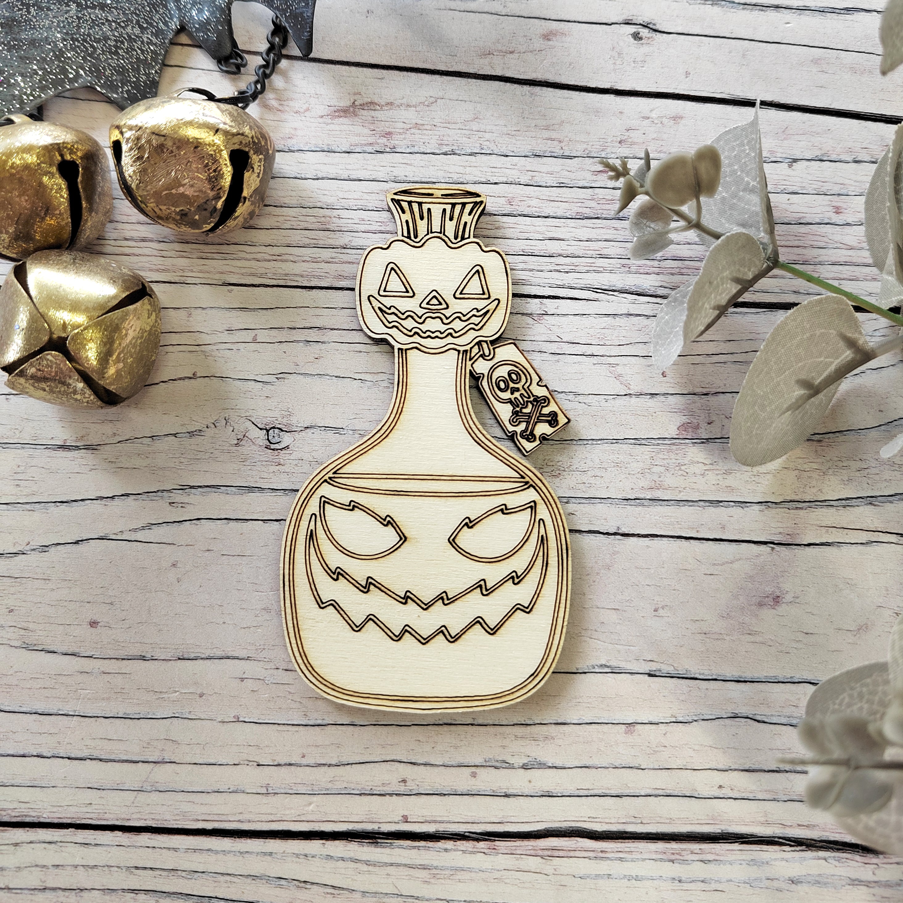 A detailed potion bottle shape with etched features. Perfect as a blank for painting your own Halloween designs.