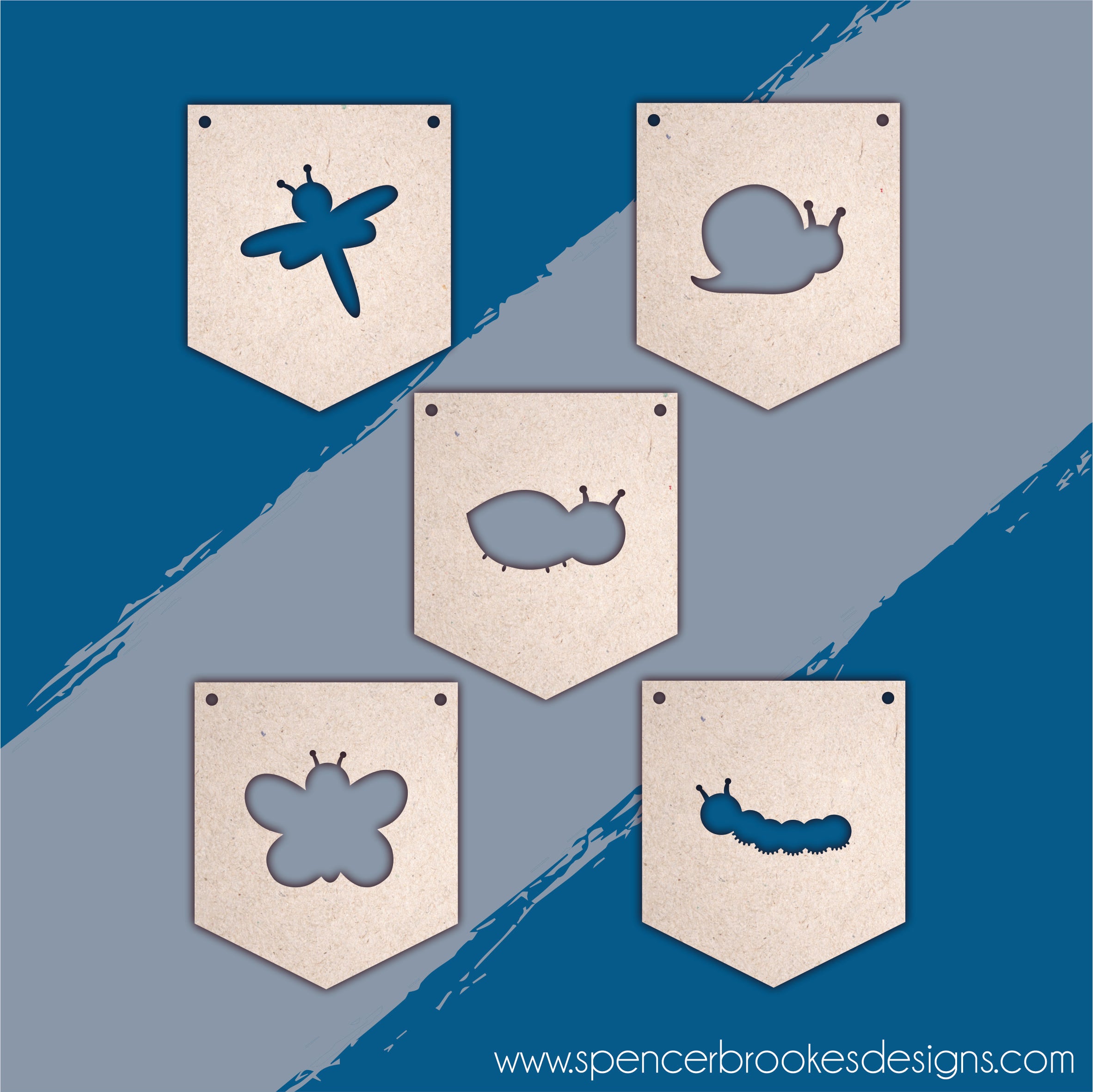 Basic children's flag bunting set with cut through mini beasts themed shapes.