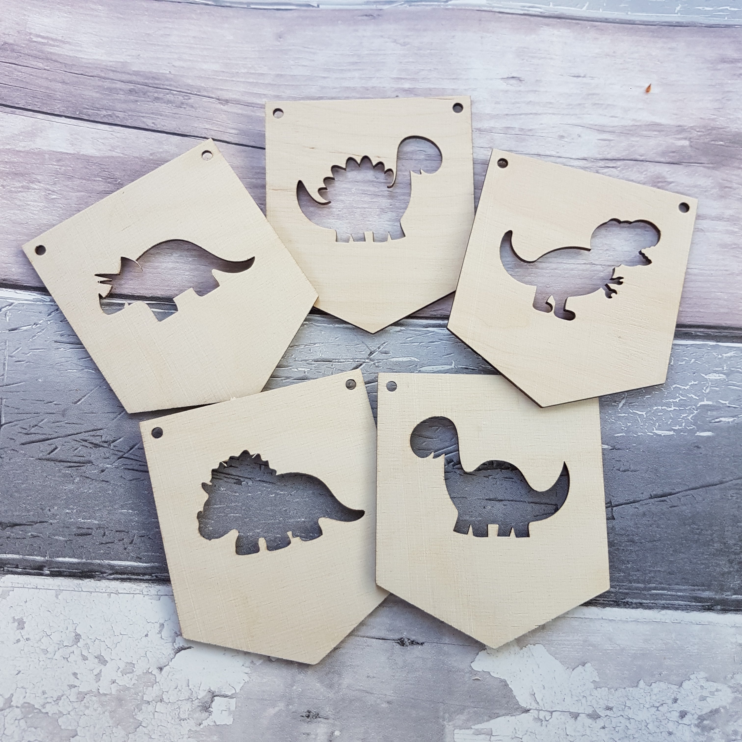 Basic children's flag bunting set with cut through dinosaur themed shapes.