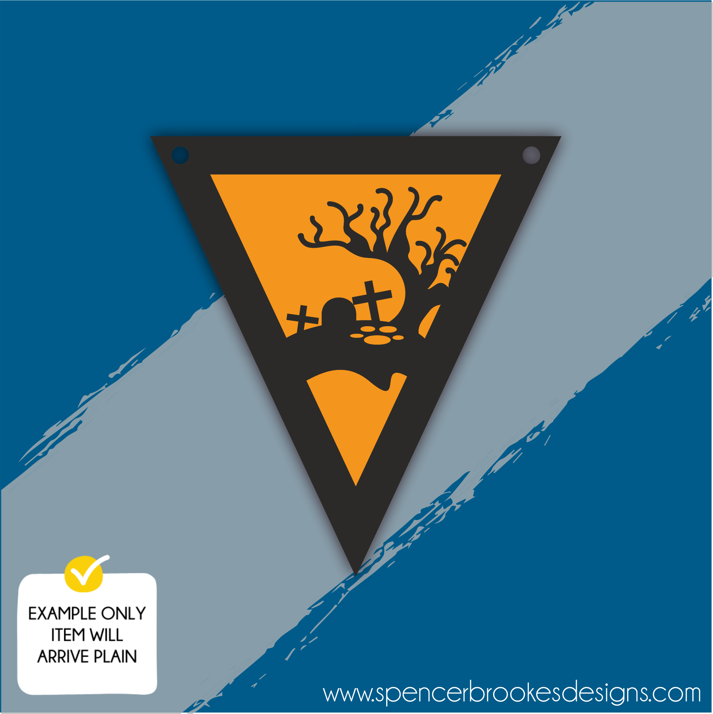 A fun triangle pennant flag shape with cut out Halloween design, and 3D back piece to sit behind. Perfect as a hanging plaque, or for creating flag bunting. Comes in multiple parts.