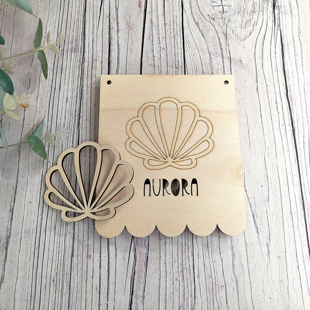 A lovely mermaid themed pennant flag, with cut through name, and a 3D shell to stick on top. Perfect for creating your own mermaid decorations.