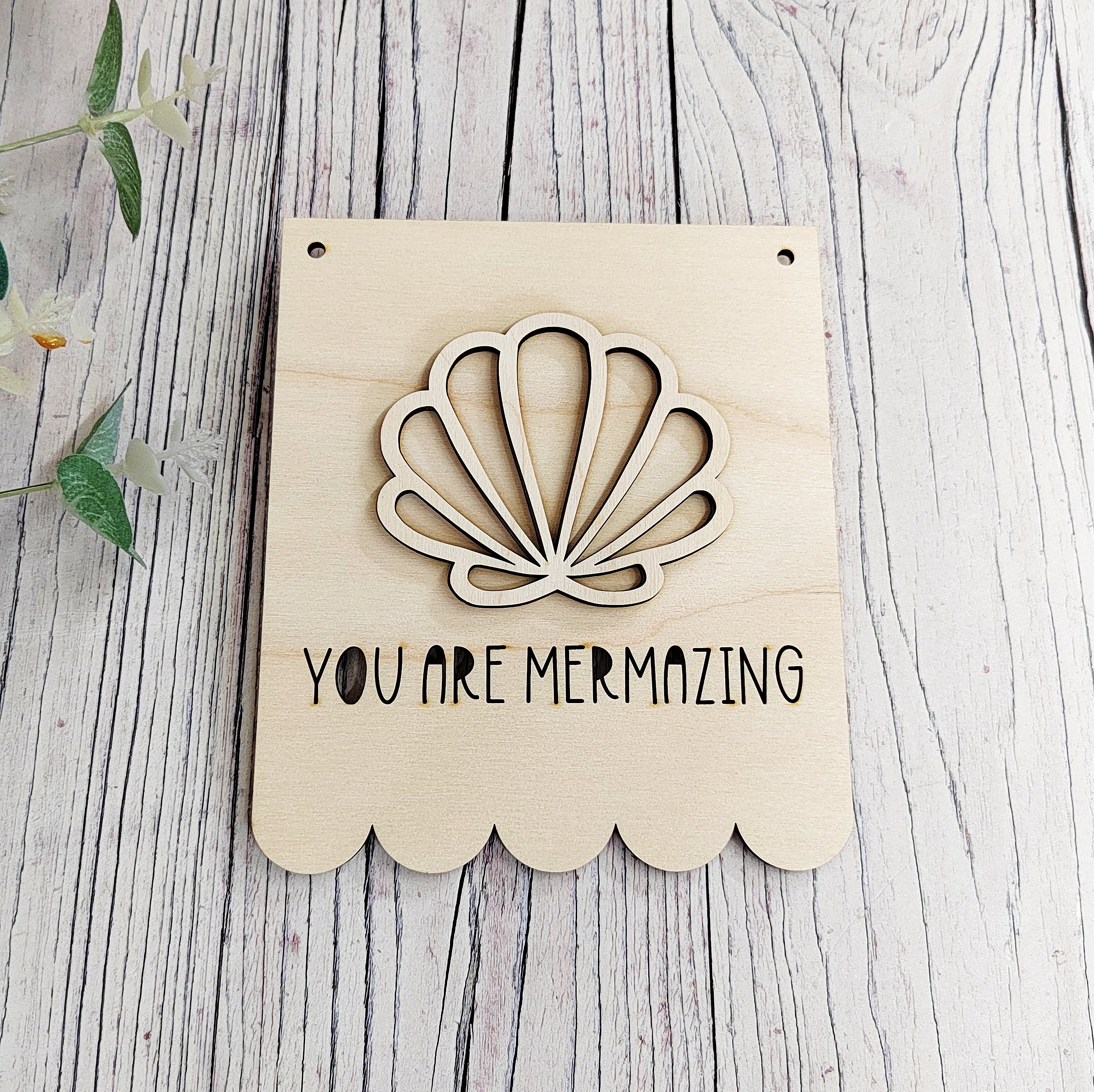A lovely mermaid themed pennant flag, with cut through text, and a 3D shell to stick on top. Perfect for creating your own mermaid decorations.