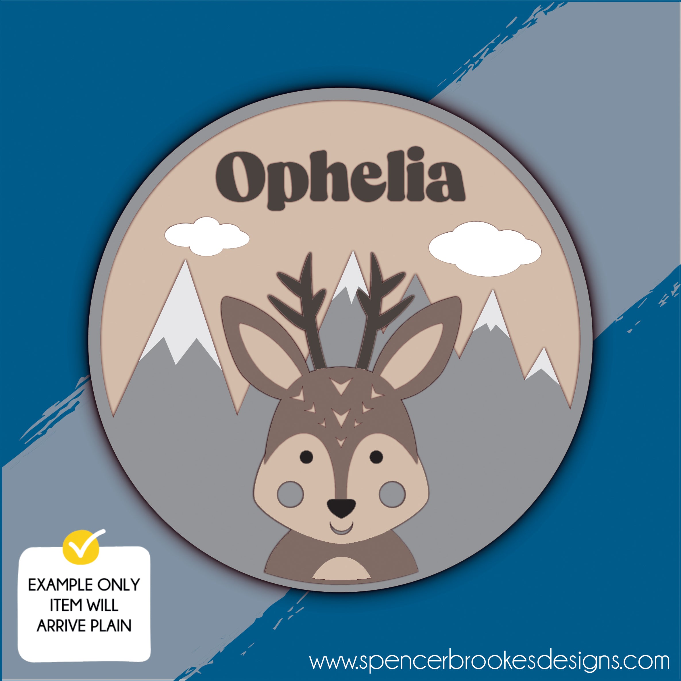 Personalised layered circle plaque with 3D deer and mountain details, and additional mdf name. Comes in multiple parts.