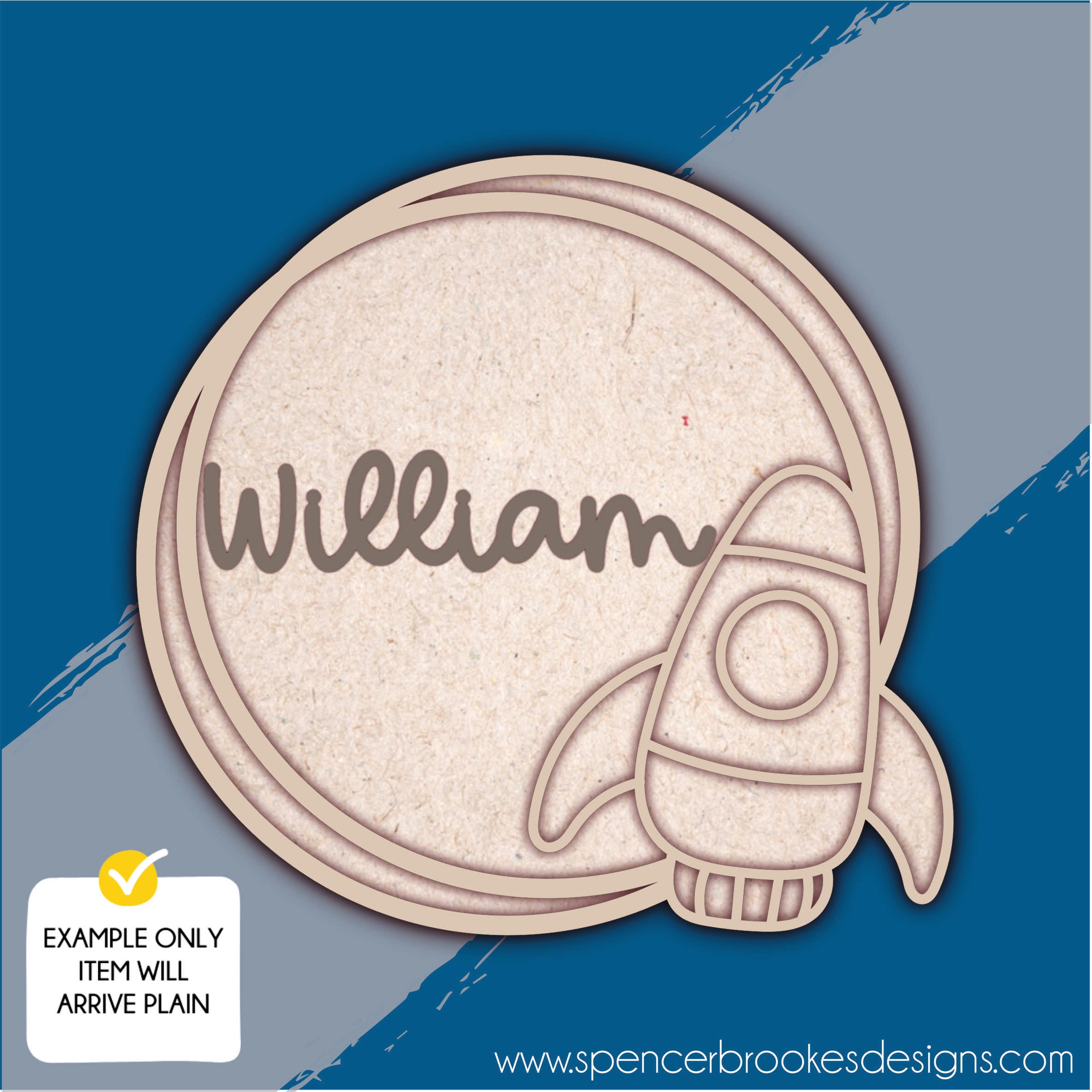 Personalised layered circle plaque with 3D rocket details, and additional mdf name. Comes in multiple parts.