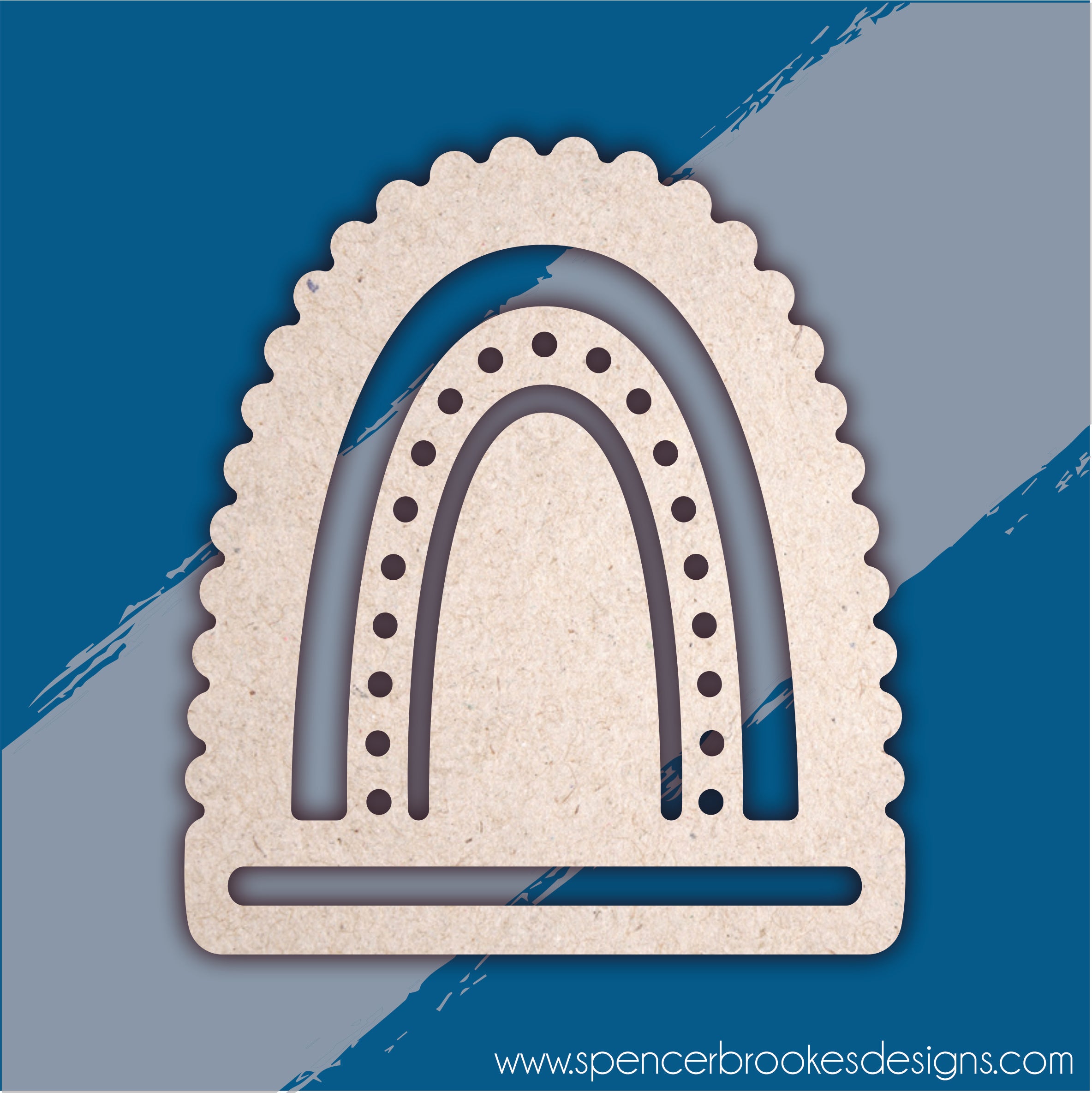A wooden plaque with an abstract rainbow design cut through, and slot at the bottom for adding ribbon or macrame designs.