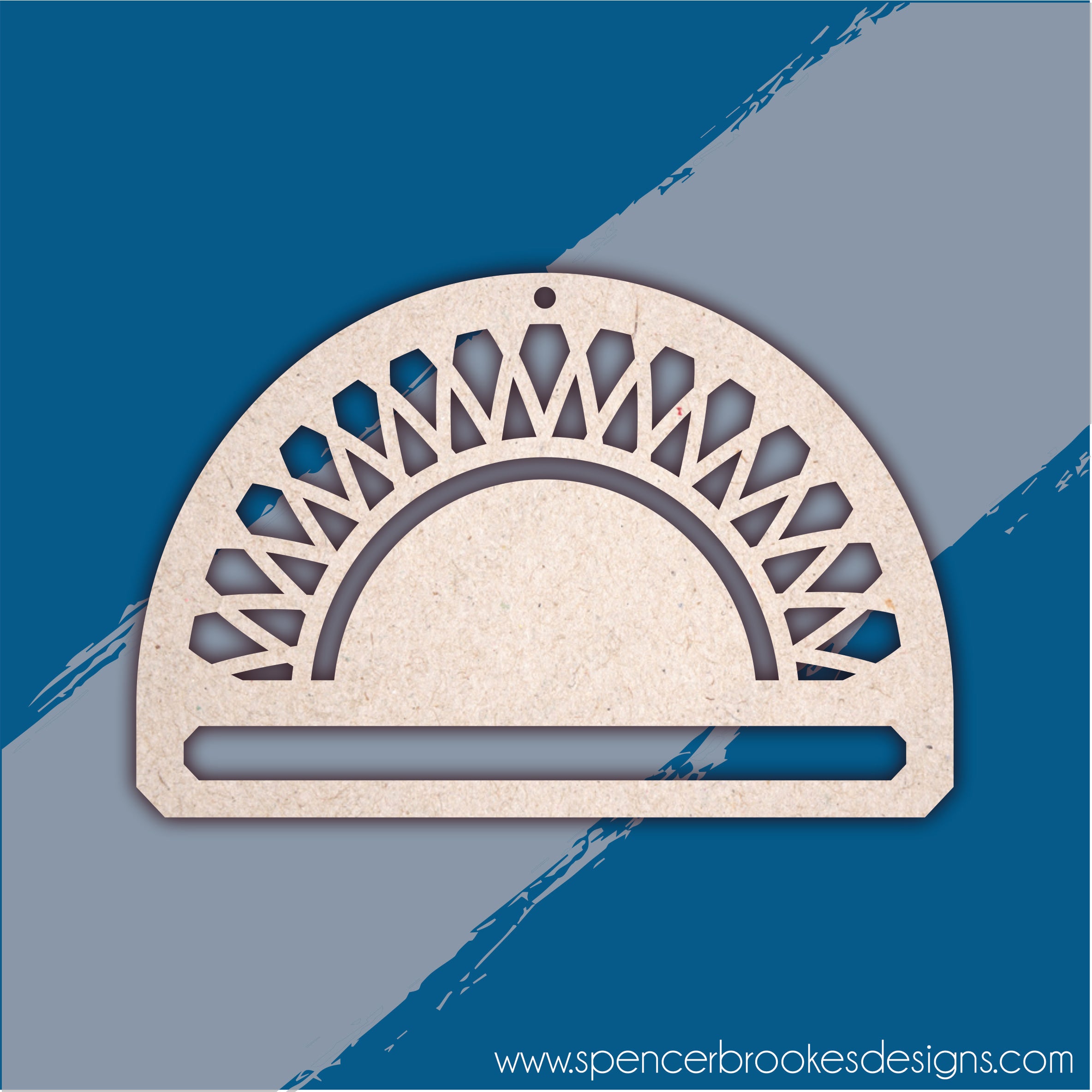 A wooden plaque with a abstract sun cut through, and slot at the bottom for adding ribbon or macrame designs.