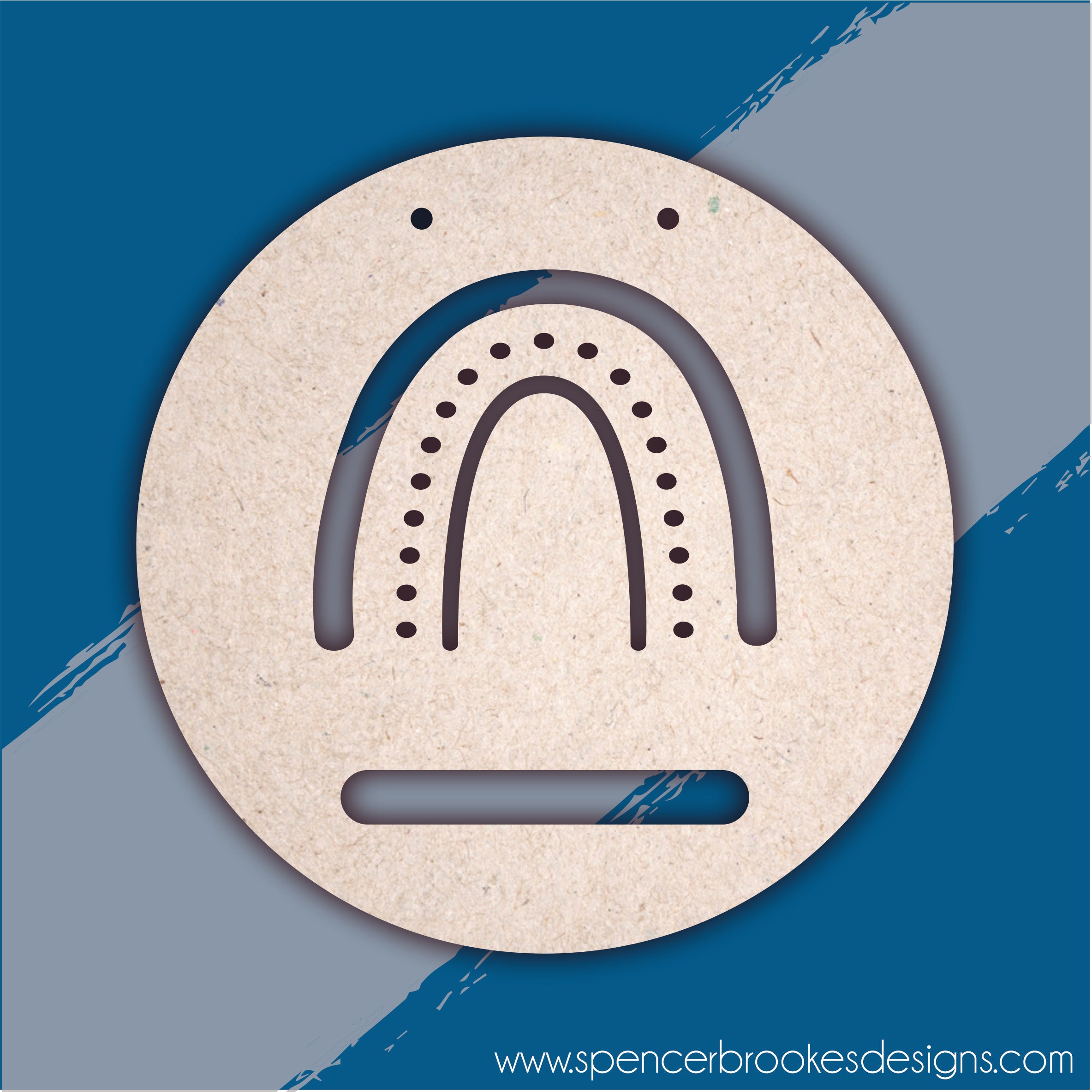 A wooden circular plaque with an abstract rainbow design cut through, and slot at the bottom for adding ribbon or macrame designs.