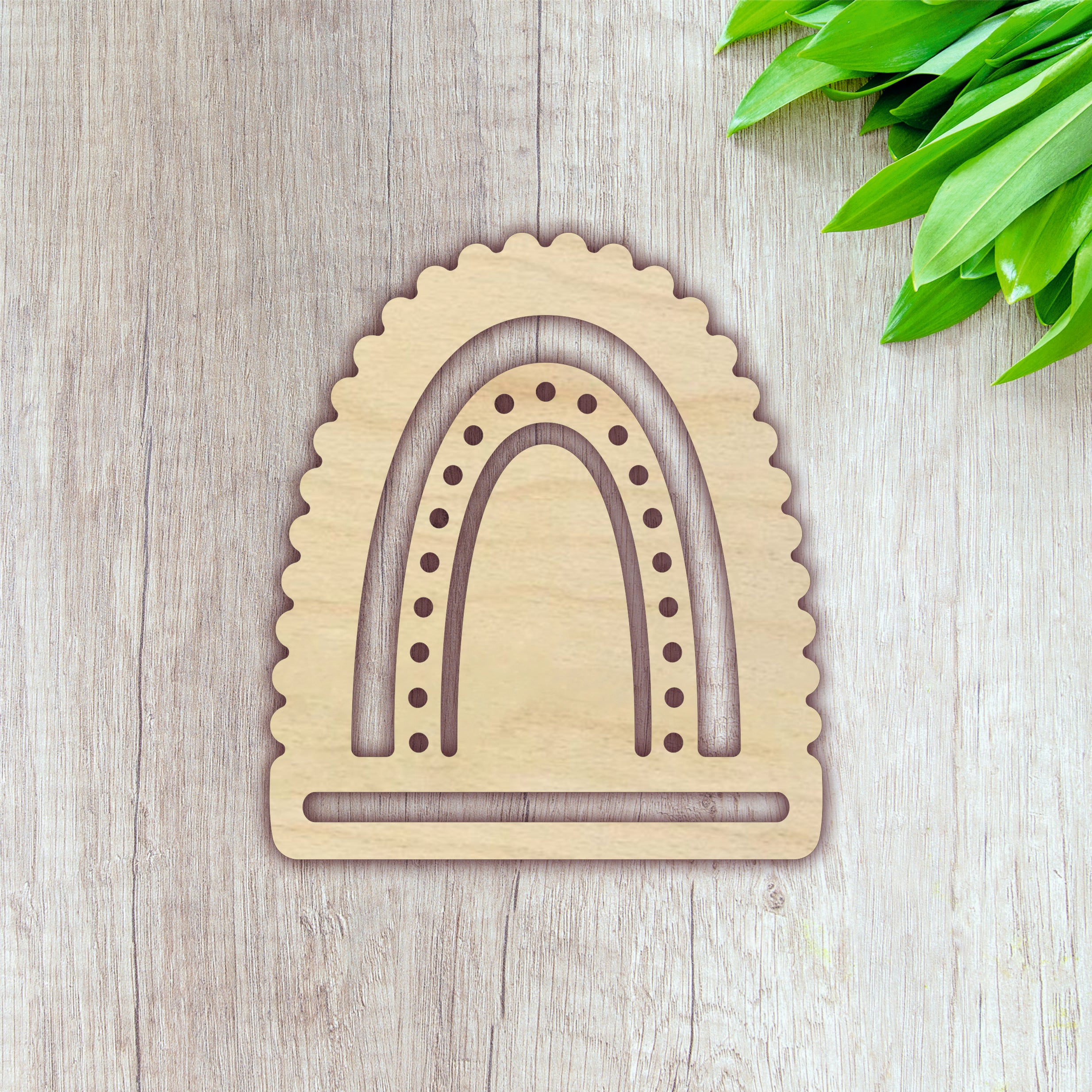 A wooden plaque with an abstract rainbow design cut through, and slot at the bottom for adding ribbon or macrame designs.
