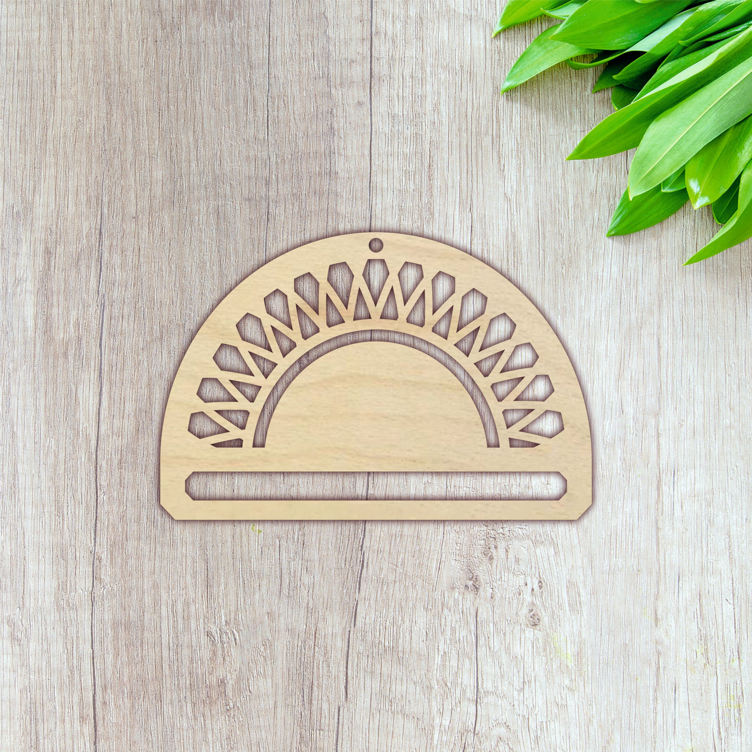 A wooden plaque with a abstract sun cut through, and slot at the bottom for adding ribbon or macrame designs.