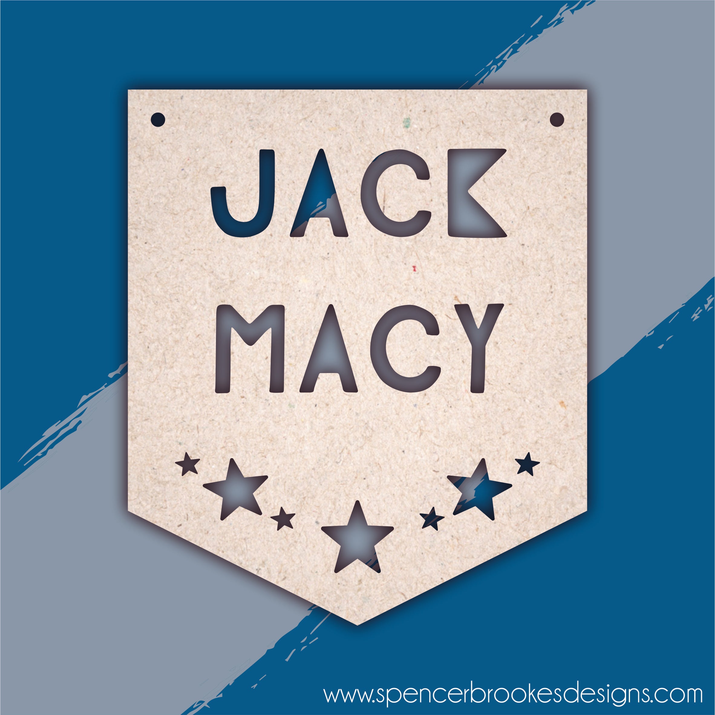 Personalised children's hanging pennant flag with cut through text and stars detail.