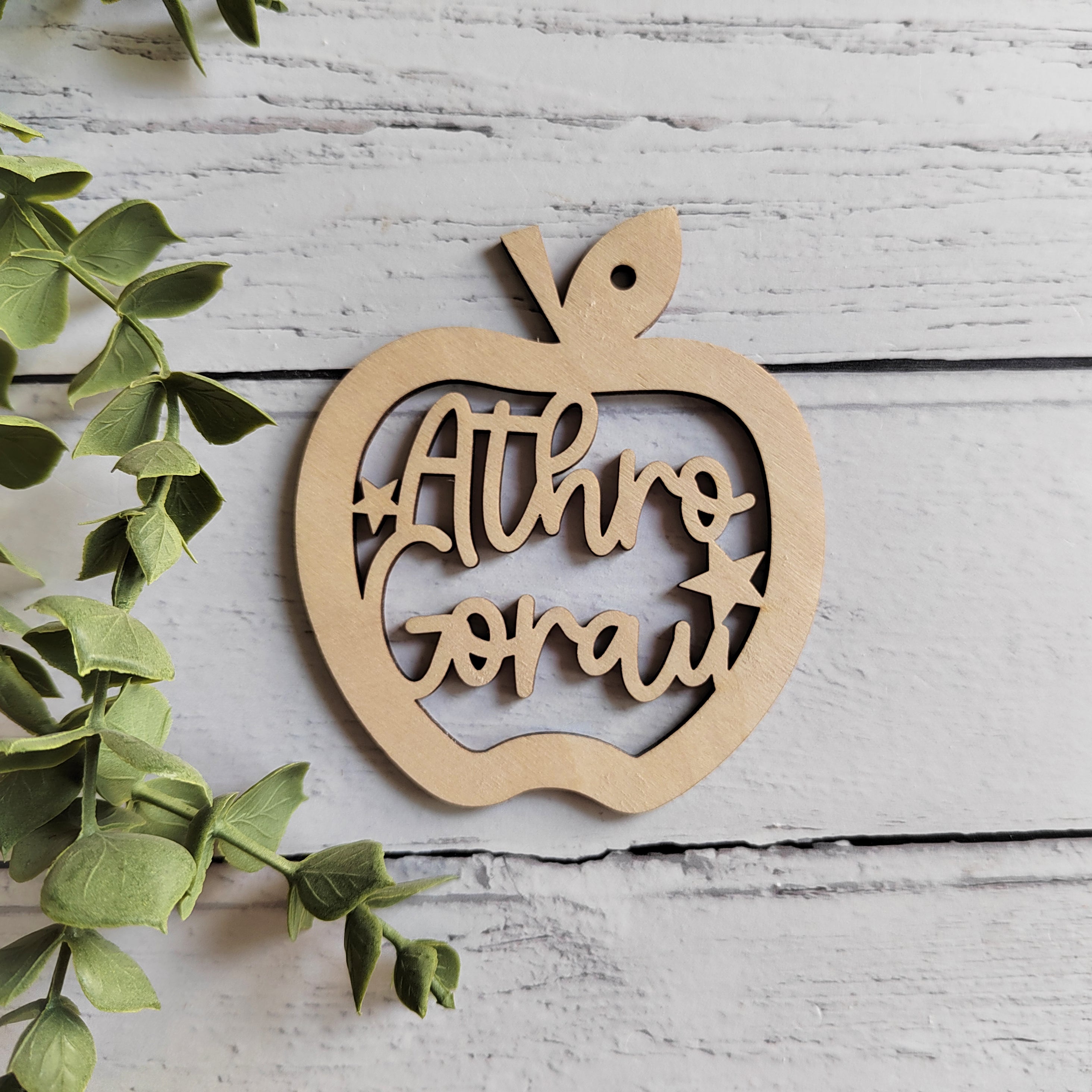 Athro gorau apple with cut through text detail in a swirly font.