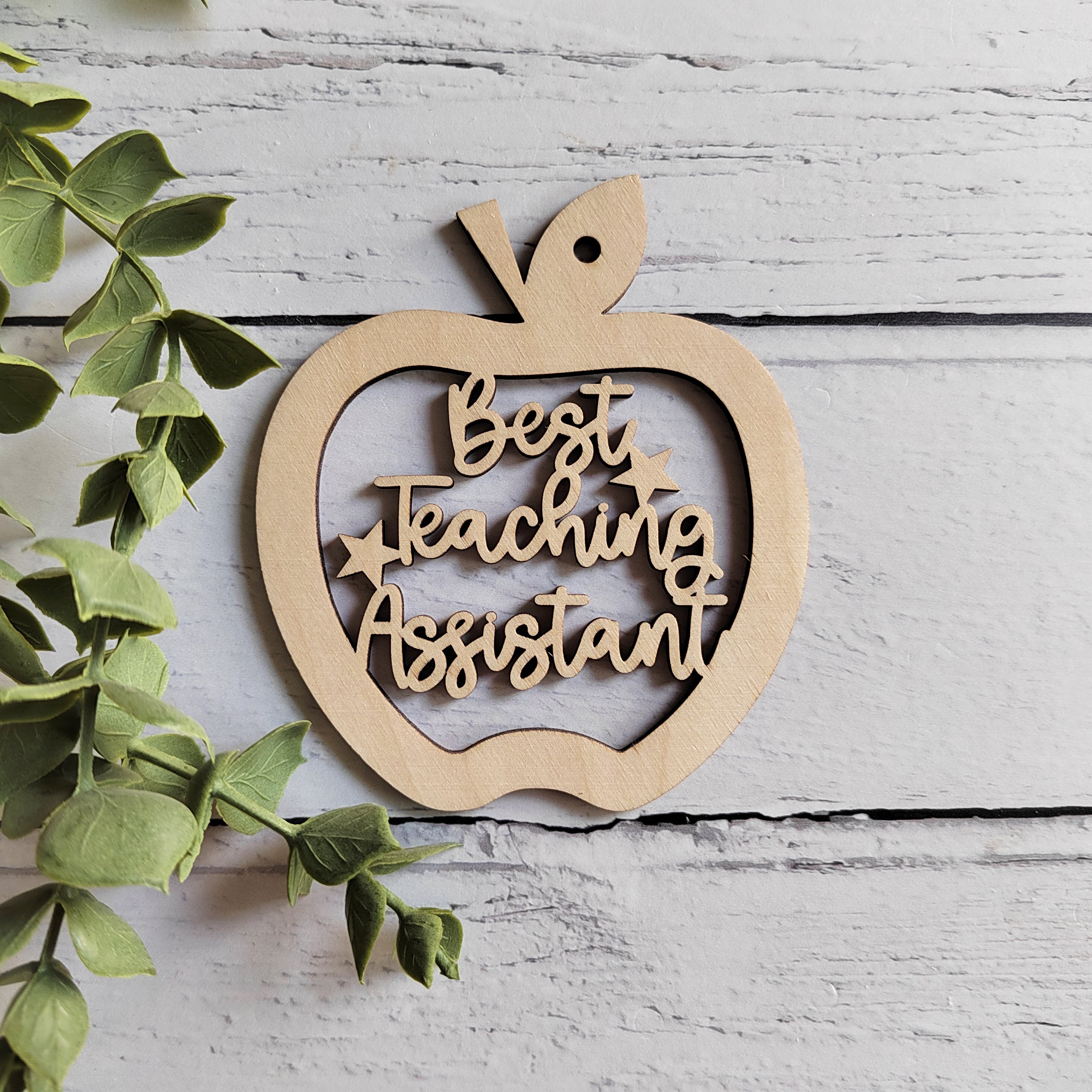 Thank you teaching assistant apple with cut through text detail in a swirly font.
