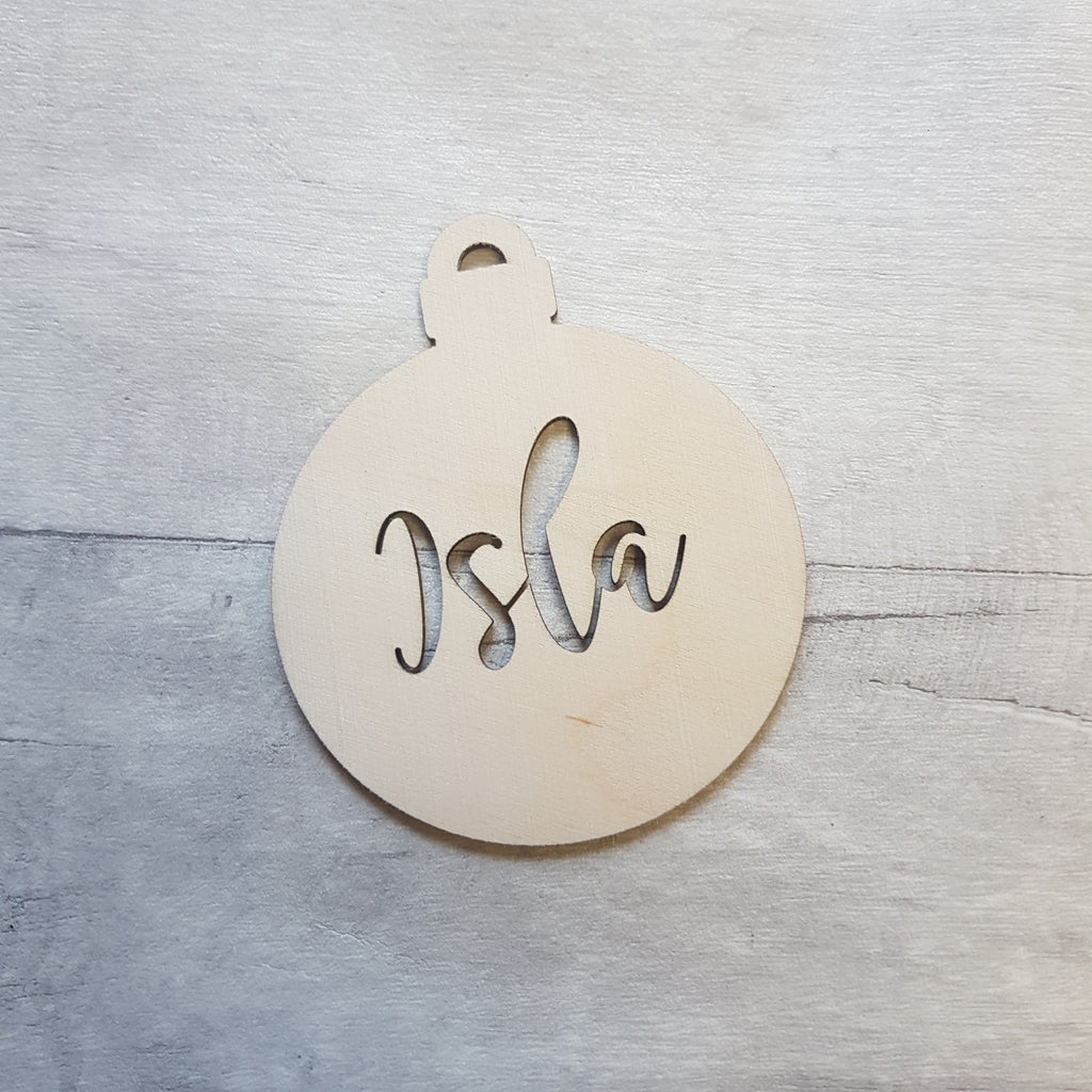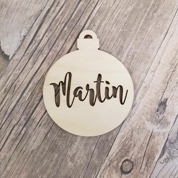 A classic shaped bauble, personalised with a single name in the center in a stylish font.