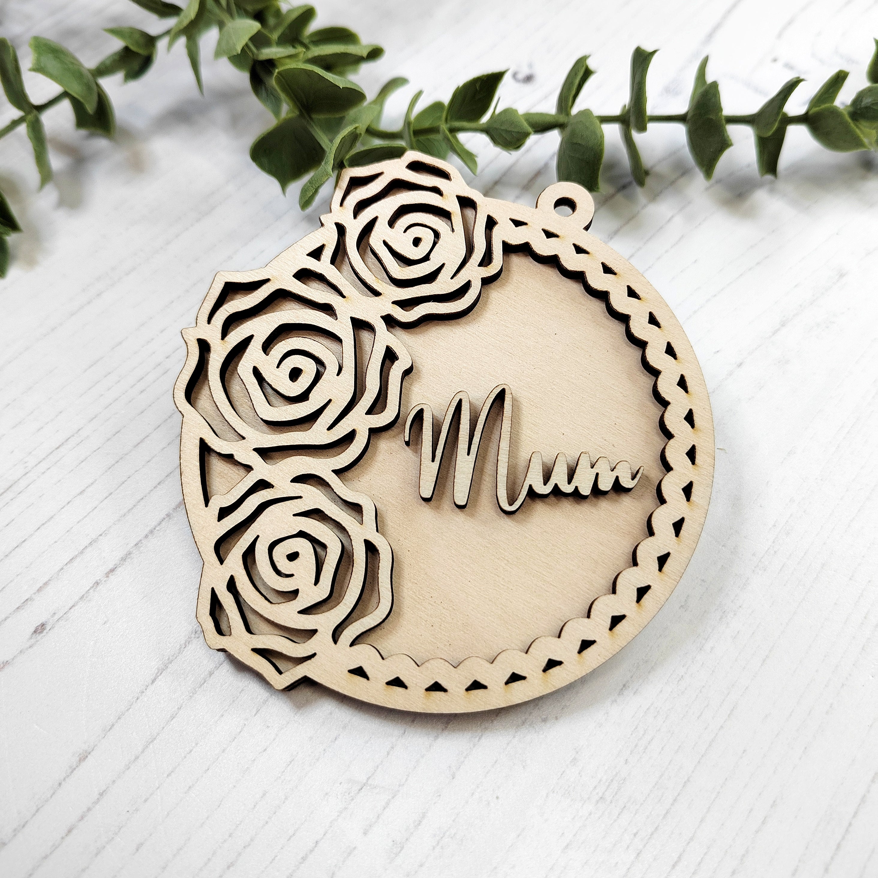 A cut little two layered hanging decoration with the name cut through. Perfect for a Mother's Day gift.