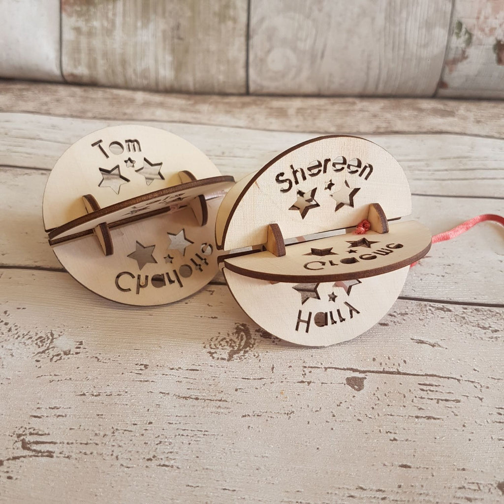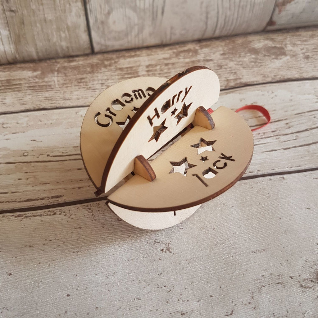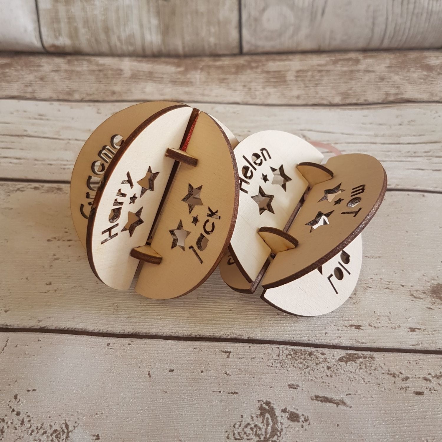 A 3D ball shaped bauble with multiple sides to hold upto four names.