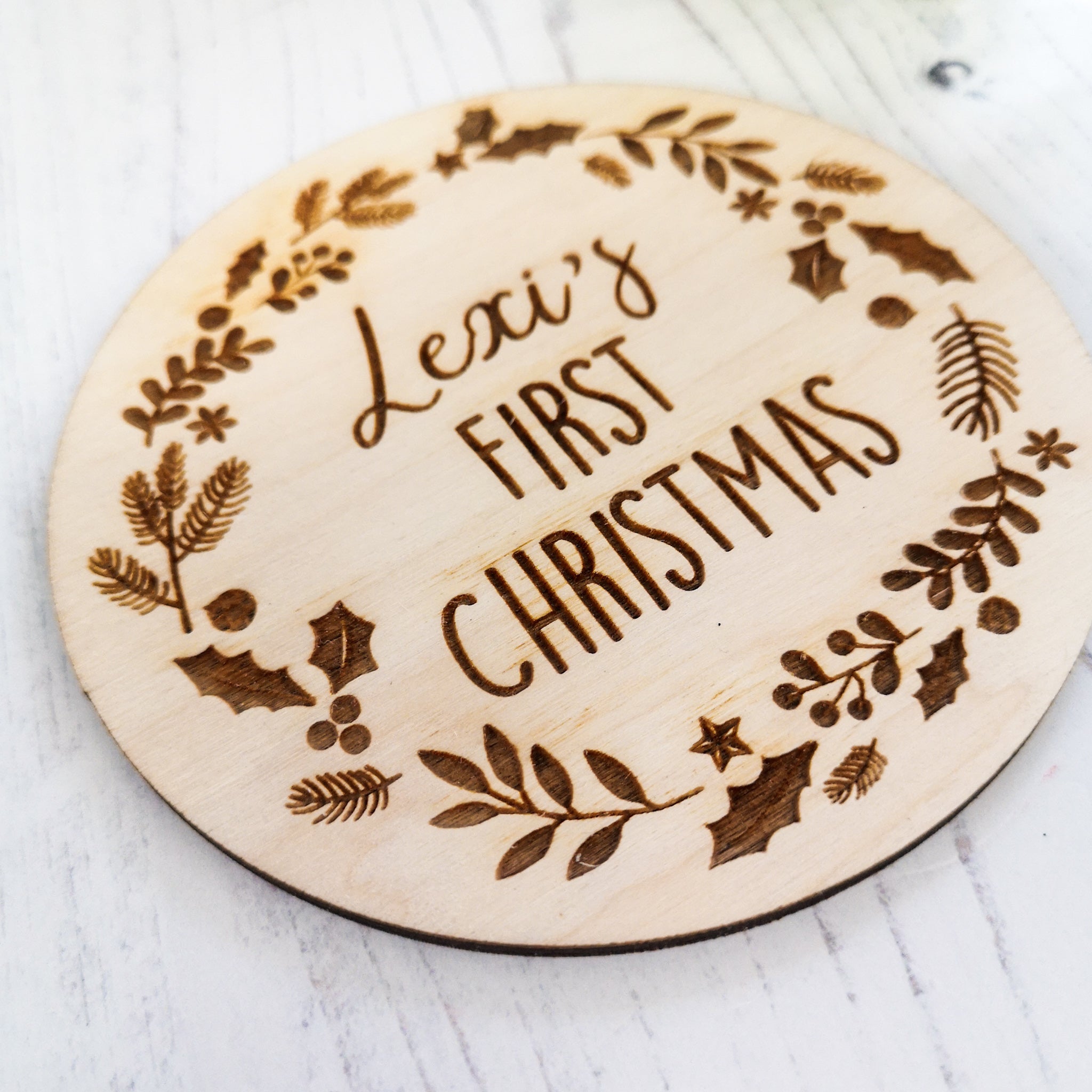 A lovely engraved plaque with festive vine wreath. Perfect for documenting their first Christmas.